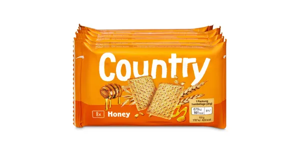 Dauerbackware Country Cracker Honig bietet einen feinen Geschmack von Honig und eignet sich perfekt für ein ausgewogenes Frühstück oder als Snack zwischendurch. Diese Cracker überzeugen durch ihre knusprige Textur und harmonieren ideal mit verschiedenen Aufstrichen. Erleben Sie die Kombination aus natürlicher Süsse und angenehmem Crunch bei jedem Bissen. – Zutaten: Getreidemehle 58% (WEIZEN [Halbweiss, Vollkorn], HAFER, DINKEL), Getreideschrote 27% (ROGGEN, DINKEL, GERSTE), Honig 10%, Sonnenblumenöl, Zucker, GERSTENMALZEXTRAKT, Hefe, Kochsalz, GERSTENMALZMEHL, Backtriebmittel (E 500). Kann Spuren von EIERN, HASELNUSS, MANDELN, MILCH, SESAM enthalten. Zutaten: Getreidemehle 58% (WEIZEN [Halbweiss, Vollkorn], HAFER, DINKEL), Getreideschrote 27% (ROGGEN, DINKEL, GERSTE), Honig 10%, Sonnenblumenöl, Zucker, GERSTENMALZEXTRAKT, Hefe, Kochsalz, GERSTENMALZMEHL, Backtriebmittel (E 500). Kann Spuren von EIERN, HASELNUSS, MANDELN, MILCH, SESAM enthalten.