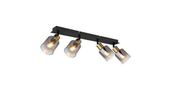 Gestalte dein Zuhause mit der Deckenleuchte Hollsy 4-flammig und setze so stilvolle Akzente im Raum. Diese hochwertige Deckenleuchte überzeugt durch ihr modernes Design und die exzellente Lichtverteilung. Die Leuchte besteht aus robustem Metall in Schwarz und Messing und ist mit zwei eleganten, rauchgrauen Glasschirmen ausgestattet, die eine warme und einladende Atmosphäre schaffen.