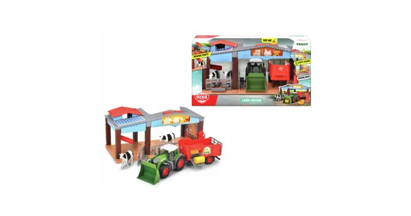 Spielzeug-Bauernhof mit Traktor und Anhänger, mit Licht- und Soundeffekte. Inklusive 2 Kühen, 3 Strohballen• Grösse: 17 x 30 x 15 cm• Inkl. Batterien: 2x AAA 1,5V-R03• ab 3 Jahren