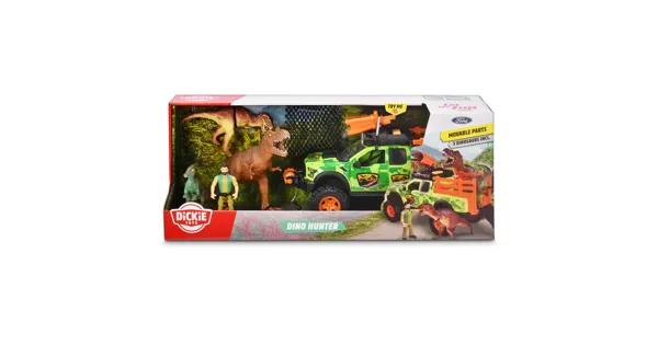 Die Dinos sind los! - Mit seinem Geländewagen Jeepster Commander (Original Jeep-Lizenz im Massstab 1:24) samt Anhänger mit Käfig macht sich der Ranger auf die Suche nach den Riesenechsen. Jeep fürs wilde Gelände - Der Freilauf-Geländewagen ist das richtige Gefährt für die raue Natur: gefederte Gummireifen, öffnende Türen, Tuning-Teile und Licht & Sound (inkl. Batterien) Plus 2 Dinosaurier - Neben dem Spielzeugauto und dem Anhänger mit Käfig und Laderampe sind im Spielzeug-Set eine bewegliche Spielzeug-Figur sowie zwei Dinosaurier enthalten.