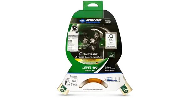 Das neue Champs 400 Cover Set aus dem Hause Donic-Schildkröt ist ein wertiges und sehr umfangreich ausgestattetes Tischtennisset in vernüftiger Freizeit-Qualität, auch für den Schulsport. Enthalten sind 2 Schläger Level 400 mit einem ITTF zugelassenen Jade Belag mit Noppen innen (glatter Belag). Unter dem Belag befindet sich ein 1,5mm starker Schwamm, der dem Schläger ein gewisses Mass an Eigenbeschleunigung verleiht, gleichzeitig aber auch genug Ballkontrolle beim Freizeitspiel. Bei diesem Schläger steht klar die Ballkontrolle im Vordergrund. Der konkave Griff liegt sicher in der Hand. Mit im Set sind 2 Einzel-Schlägerhüllen - damit können die beiden Schläger ordentlich und geschütz aufbewahrt werden. Sie sind geschützt vor Beschädigung und Verschmutzung. Ebenfalls im Set sind 4 Stück Donic-Schildkröt Qualitäts-Tischtennisbälle, 40 mm, in der neuen Poly-Qualität (2 weisse, 2 orange) - Celluloid-frei. Das komplette Set ist im Blister verpackt, damit alles unbeschädigt bei Ihnen ankommt. Auch bei der Champs Line wird ab sofort umweltfreundliches, zertifiziertes Holz der Organisation FSCTM (Forest Stewarship CouncilTM) verwendet.