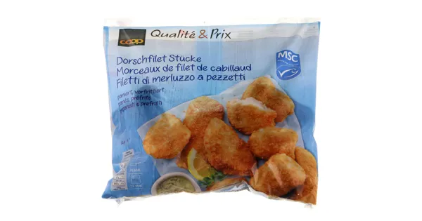 Dorschfilets (Gadus morhua) paniert, vorfrittiert – Zutaten: DORSCHFILETS* 70% (gefangen im Nordostatlantik, Schleppnetze [Grundscherbrettnetze]), WEIZENSTÄRKE, Sonnenblumenöl, Wasser, Weizenmehl angereichert mit Eisen und Niacin (WEIZENMEHL, Eisen, Niacin), Kochsalz, Hefe, Emulgator (E 415), Trennmittel (E 170), Glucose, Säuerungsmittel (E 330), modifizierte WEIZENSTÄRKE (E 1404). * Aus einer MSC-zertifizierten nachhaltigen Fischerei. www.msc.org/ch. Zutaten: DORSCHFILETS* 70% (gefangen im Nordostatlantik, Schleppnetze [Grundscherbrettnetze]), WEIZENSTÄRKE, Sonnenblumenöl, Wasser, Weizenmehl angereichert mit Eisen und Niacin (WEIZENMEHL, Eisen, Niacin), Kochsalz, Hefe, Emulgator (E 415), Trennmittel (E 170), Glucose, Säuerungsmittel (E 330), modifizierte WEIZENSTÄRKE (E 1404). * Aus einer MSC-zertifizierten nachhaltigen Fischerei. www.msc.org/ch.