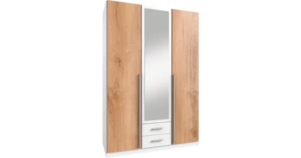 Der Drehtürenschrank Kuga ist dein neuer Ordnungshelfer im Schlafzimmer! Mit einer Breite von 135 cm, einer Höhe von 197 cm und einer Tiefe von 58 cm bietet er viel Platz für deine Kleidung. Drei Türen, eine davon mit praktischem Spiegel, sorgen für optimale Übersicht. Die praktische Inneneinteilung mit Kleiderstange und Einlegeböden hilft, alles übersichtlich zu verstauen. Socken und Unterwäsche finden in den zwei Schubladen Platz. Die Kombination aus hellem Weiss und warmem Eiche-Dekor fügt sich harmonisch in jedes Ambiente ein. Mach jetzt den Schritt zu mehr Ordnung und Stil in deinem Zuhause!