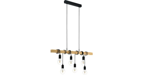 Diese Hängeleuchte der Serie Townshend ist aus schwarzem Stahl und braunem Holz gefertigt. Zum Strahlen werden sechs E27-Leuchtmittel benötigt.