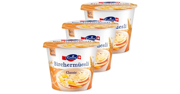 Birchermüesli mit Jogurt, Früchten und Vollkornflocken 200 g. – Zutaten: Jogurt aus pasteurisierter Schweizer MILCH 50 %, Früchte 30 % (Äpfel 20 %, Ananas 9 %, Bananenpüree 1 %), Vollkornflocken 7 % (WEIZEN, DINKEL, HAFER), Zucker, Wasser, Zitronensaftkonzentrat, Verdickungsmittel Pektin, HASELNÜSSE 0,1 %, natürliches Aroma. Zutaten: Jogurt aus pasteurisierter Schweizer MILCH 50 %, Früchte 30 % (Äpfel 20 %, Ananas 9 %, Bananenpüree 1 %), Vollkornflocken 7 % (WEIZEN, DINKEL, HAFER), Zucker, Wasser, Zitronensaftkonzentrat, Verdickungsmittel Pektin, HASELNÜSSE 0,1 %, natürliches Aroma.