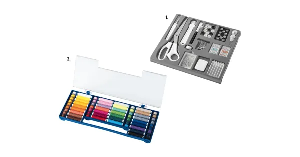 , Set-Inhalt Schneiderset: 30 Nähnadeln, 120 Stahl-Stecknadeln, 1 Markierrad, 1 Universal-Schere u. v. m. , Set-Inhalt Nähgarn-Sortiment: 32 Nähgarnspulen à 50 m, 32 Unterfadenspulen à 25 m , Pro Set