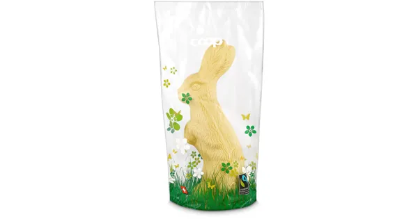 Weisse Schweizer Schokolade Der Fairtrade Osterhase stehend weiss aus zarter weisser Schokolade überzeugt durch seinen feinen Geschmack und wurde mit Fairtrade-zertifizierten Zutaten hergestellt. Perfekt geeignet, um die Ostertage genussvoll zu feiern. Geniessen Sie bewussten Genuss mit einem Hauch von Süsse in jeder Figur. – Zutaten: Zucker, Kakaobutter, VOLLMILCHPULVER (Schweiz), MAGERMILCHPULVER, Emulgator (E 322 aus SOJA), natürliches Aroma. Kann Spuren von HASELNUSS, MANDELN enthalten. > Fairtrade-Kakao und -Zucker mit Mengenausgleich. Gesamtanteil: 74,2%. Zutaten: Zucker, Kakaobutter, VOLLMILCHPULVER (Schweiz), MAGERMILCHPULVER, Emulgator (E 322 aus SOJA), natürliches Aroma. Kann Spuren von HASELNUSS, MANDELN enthalten. > Fairtrade-Kakao und -Zucker mit Mengenausgleich. Gesamtanteil: 74,2%.