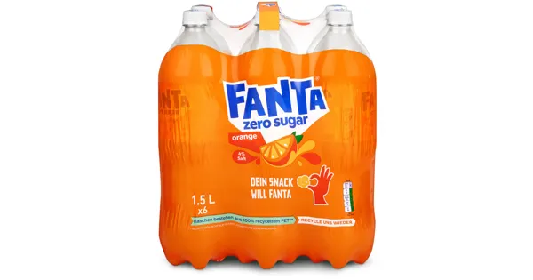 Kalorienfreies Erfrischungsgetränk mit Orangenaroma. Mit Süssungsmitteln Echter Fanta Geschmack. Zero Zucker. – Zutaten: Wasser, Orangensaft aus Orangensaftkonzentrat (3%), Kohlensäure, Säuerungsmittel: Citronensäure und Apfelsäure, Süssungsmittel: Cyclamat, Acesulfam K, Sucralose, Stevioglycoside und Neohesperidin DC, natürliches Orangenaroma mit anderen natürlichen Aromen, Konservierungsstoff: Kaliumsorbat, Antioxidationsmittel: Ascorbinsäure, Stabilisator: Quarkernmehl, Farbstoff: Karotine. Zutaten: Wasser, Orangensaft aus Orangensaftkonzentrat (3%), Kohlensäure, Säuerungsmittel: Citronensäure und Apfelsäure, Süssungsmittel: Cyclamat, Acesulfam K, Sucralose, Stevioglycoside und Neohesperidin DC, natürliches Orangenaroma mit anderen natürlichen Aromen, Konservierungsstoff: Kaliumsorbat, Antioxidationsmittel: Ascorbinsäure, Stabilisator: Quarkernmehl, Farbstoff: Karotine.