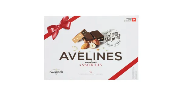 Gemischte Schokoladenpralinen Avelines ass.(noir, lait, praliné) 360g Gemischte Schokoladepralinen. – Zutaten: Zucker, Kakaomasse, HASELNÜSSE (16%), Kakaobutter, MANDELN (6%), Voll- MILCHpulver,...
