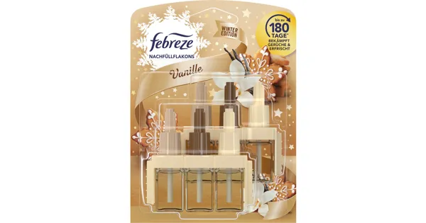 Mit Febreze 3Volution Vanille bringst du einen warmen, winterlichen Duft in dein Zuhause. Die Nachfüllflakons bekämpfen unangenehme Gerüche und wechseln automatisch zwischen drei Düften, damit du dich nicht an den Duft gewöhnst. Geniesse bis zu 180 Tage lang frische Luft mit einem sanften Vanille-Aroma.