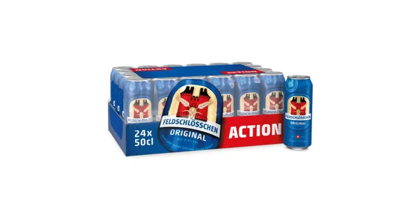 Bier Feldschlösschen Original - der Klassiker unter den Lagerbieren. Profitiere jezt vom praktischen 24x50cl Dosen Pack im Aktionsangebot. Perfekt um sich zu bevorraten. Feldschlösschen Original...