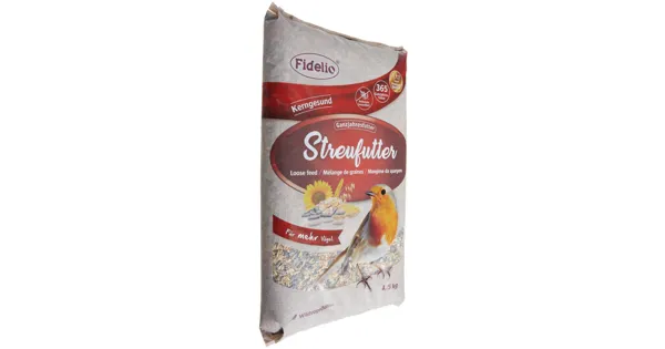 Fidelio Streufutter ist ein auf Ambrosia kontrolliertes Naturprodukt für frei lebende Vögel. Das universelle Alleinfuttermittel ist eine ausgewogene Zusammensetzung aus Sonnenblumenkernen, Weizen, Hafer und Hirse. Ergänzungsfuttermittel für freilebende Wildvögel.