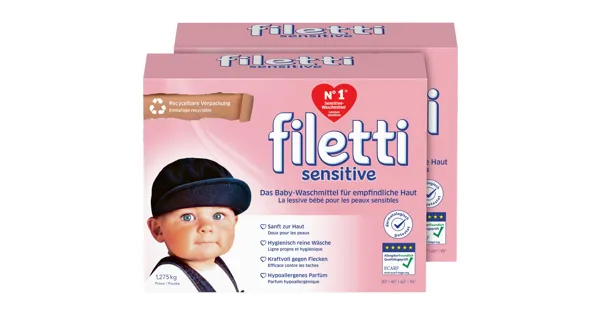 Das Filetti Waschpulver Sensitive für Babykleidung bietet eine besonders sanfte Reinigung, perfekt auf die empfindliche Haut und auf die zarten Textilien deines Babys abgestimmt. Diese milde Formel entfernt schonend Flecken und Verschmutzungen, während sie gleichzeitig die Weichheit und den Komfort der Kleidung bewahrt.
