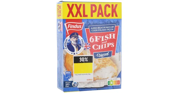Fischereierzeugnis aus Alaska-Seelachsfilet (Theragra chalcogramma), aus Fischstücken zusammengefügt, paniert, vorfrittiert, tiefgekühlt Findus Fish & Chips Filet XXL überzeugt mit einem besonders grossen, panierten Fischfilet. Die knusprige Hülle sorgt für ein stimmiges Genusserlebnis, während das zarte Fischfilet im Inneren angenehm saftig bleibt. Ideal für die Zubereitung im Ofen oder in der Fritteuse. – Zutaten: ALASKA-SEELACHSFILET 51% (gefangen im (FAO 67) Nordostpazifik und (FAO 61) Nordwestpazifik, Fanggerät: Schleppnetze), WEIZENMEHL angereichert (WEIZEN, Calciumcarbonat, Eisen, Niacin, Thiamin), Wasser, Rapsöl, WEIZENSTÄRKE, Backtriebmittel (Diphosphate, Natriumcarbonat), Kochsalz, Reismehl, Maismehl, SENF, Traubenzucker, Knoblauchpulver, WEIZENGLUTEN, natürliches Aroma (SENF), Paprika, Kurkumaextrakt, karamellisierter Zucker, Pfefferextrakt. Kann MILCH enthalten. Zutaten: ALASKA-SEELACHSFILET 51% (gefangen im (FAO 67) Nordostpazifik und (FAO 61) Nordwestpazifik, Fanggerät: Schleppnetze), WEIZENMEHL angereichert (WEIZEN, Calciumcarbonat, Eisen, Niacin, Thiamin), Wasser, Rapsöl, WEIZENSTÄRKE, Backtriebmittel (Diphosphate, Natriumcarbonat), Kochsalz, Reismehl, Maismehl, SENF, Traubenzucker, Knoblauchpulver, WEIZENGLUTEN, natürliches Aroma (SENF), Paprika, Kurkumaextrakt, karamellisierter Zucker, Pfefferextrakt. Kann MILCH enthalten.