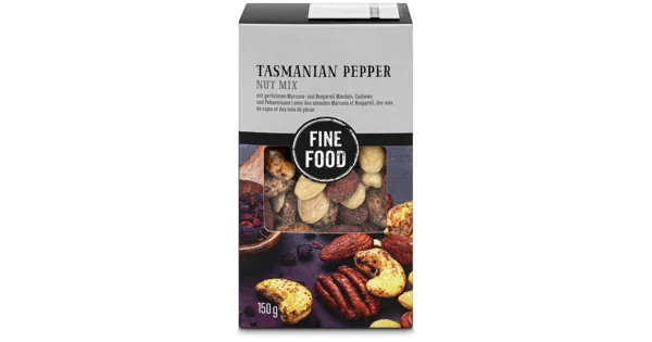 Nussmischung geröstet mit Salz und Pfeffer Entdecken Sie den Fine Food FSI Nut Mix Tasmanian Pepper, eine ausgewählte Mischung von Nüssen, die mit tasmanischem Pfeffer verfeinert wurde. Die harmonische Balance aus milden und würzigen Noten macht ihn zu einem besonderen Genussmoment. Ein hochwertiger Snack mit einzigartigem Aroma, ideal für anspruchsvolle Geniesser. – Zutaten: Cashewnüsse geröstet, gewürzt 30% (CASHEWNÜSSE 29%, Kochsalz, Tasmanischer Pfeffer 0,4%, Verdickungsmittel [E 414]), Pekannüsse geröstet, gesalzen 25% (PEKANNÜSSE 24%, Kochsalz, Verdickungsmittel [E 414]), Mandeln geröstet, gewürzt 25% (MANDELN 24%, Kochsalz, Tasmanischer Pfeffer 0,2%, Verdickungsmittel [E 414]), Mandeln geröstet, gesalzen 20% (MANDELN 19%, Kochsalz, Verdickungsmittel [E 414]). Kann Spuren von BAUMNUSS, ERDNUSS, HASELNUSS, MACADAMIANUSS, PARANUSS, PISTAZIEN enthalten. Zutaten: Cashewnüsse geröstet, gewürzt 30% (CASHEWNÜSSE 29%, Kochsalz, Tasmanischer Pfeffer 0,4%, Verdickungsmittel [E 414]), Pekannüsse geröstet, gesalzen 25% (PEKANNÜSSE 24%, Kochsalz, Verdickungsmittel [E 414]), Mandeln geröstet, gewürzt 25% (MANDELN 24%, Kochsalz, Tasmanischer Pfeffer 0,2%, Verdickungsmittel [E 414]), Mandeln geröstet, gesalzen 20% (MANDELN 19%, Kochsalz, Verdickungsmittel [E 414]). Kann Spuren von BAUMNUSS, ERDNUSS, HASELNUSS, MACADAMIANUSS, PARANUSS, PISTAZIEN enthalten.