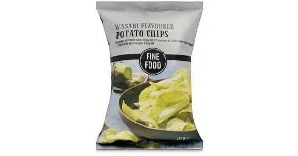 Pommes Chips mit Wasabigeschmack – Zutaten: Kartoffeln, natives Olivenöl extra DOP, Gewürzzubereitung (Zucker, Kochsalz, Gewürze, Aroma, Reismehl, Farbstoff [E 141]), Meersalz, Meerrettich, Wasabi 0.1% (japanischer Meerrettich). Zutaten: Kartoffeln, natives Olivenöl extra DOP, Gewürzzubereitung (Zucker, Kochsalz, Gewürze, Aroma, Reismehl, Farbstoff [E 141]), Meersalz, Meerrettich, Wasabi 0.1% (japanischer Meerrettich).