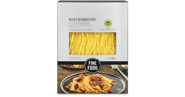 Eierteigwaren – Zutaten: HARTWEIZENGRIESS, EIER* 34% (Italien). * aus Bodenhaltung. Zutaten: HARTWEIZENGRIESS, EIER* 34% (Italien). * aus Bodenhaltung.