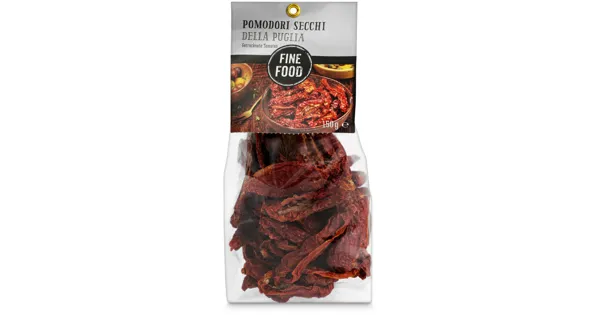 Tomaten getrocknet, gesalzen Die Fine Food Pomodori secchi sind sorgfältig getrocknete Tomaten, die sich perfekt als aromatische Zutat in diversen Gerichten eignen. Diese hochwertigen, sonnenverwöhnten Tomaten verleihen Ihren Speisen eine mediterrane Note. Erleben Sie den authentischen Geschmack Italiens mit den Fine Food Pomodori secchi. – Zutaten: Tomaten (Italien), Meersalz. Zutaten: Tomaten (Italien), Meersalz.