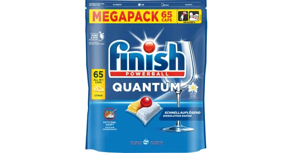 Die Finish Quantum Citrus Caps bieten dir eine Premium-Reinigung für strahlend sauberes Geschirr. Dank der 3-Kammer-Technologie lösen sich die Caps schnell auf und wirken sofort gegen hartnäckige Speisereste, Fett und eingetrocknete Flecken – auch bei Kurz- und Eco-Programmen. Mit integriertem Klarspüler und Salzfunktion sowie einem frischen Citrus-Duft für extra Glanz und Frische. Der Megapack mit 65 Caps sorgt für langanhaltende Sauberkeit und Maschinenpflege.