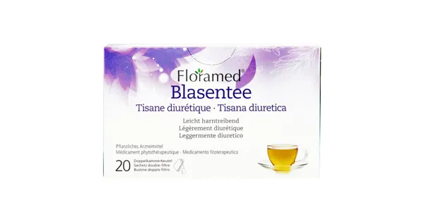 Pflanzliches Arzneimittel, Blasentee Floramed Blasentee 20er-Packung SM E – Zutaten: Birkenblätter (20%), Queckenwurzeln (20%), Riesengoldrutenkraut (20%), Hauhechelwurzeln (20%), Süssholzwurzeln (20%). Zutaten: Birkenblätter (20%), Queckenwurzeln (20%), Riesengoldrutenkraut (20%), Hauhechelwurzeln (20%), Süssholzwurzeln (20%).