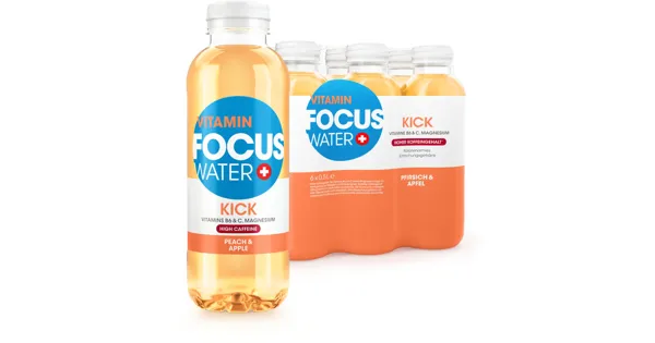 Kalorienarmes Erfrischungsgetränk mit 4% Fruchtsäften, natürlichen Aromen, 6 Vitaminen, Magnesium und Zink. Isotonisch FOCUSWATER Kick Pfirsich & Apfel kombiniert spritzige Erfrischung mit harmonischem Geschmack aus fruchtigem Pfirsich und Apfel. Das isotonische Getränk ist ideal für unterwegs und sorgt mit sorgfältig abgestimmten Inhaltsstoffen für pure Erfrischung. Ein moderner Begleiter für aktive Tage, ohne zu beschweren. – Zutaten: Wasser, Fructosesirup, 4% Fruchtsaft aus Konzentrat (Pfirsich 2%, Apfel 2%), natürliche Aromen, Säuerungsmittel (Zitronensäure), Farbstoff (Carotine), Vitamine (Niacin B3, Pantothensäure B5, B6, Biotin B7, C, D), Magnesium, Zink, natürliches Coffein. Zutaten: Wasser, Fructosesirup, 4% Fruchtsaft aus Konzentrat (Pfirsich 2%, Apfel 2%), natürliche Aromen, Säuerungsmittel (Zitronensäure), Farbstoff (Carotine), Vitamine (Niacin B3, Pantothensäure B5, B6, Biotin B7, C, D), Magnesium, Zink, natürliches Coffein.