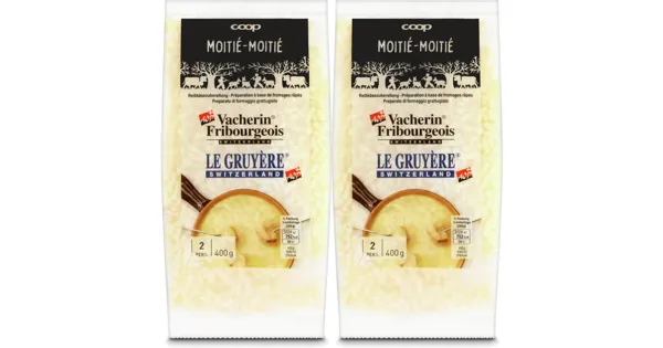 Reibkäsezubereitung Das Fondue Moitié-Moitié vereint würzigen Greyerzer und cremigen Freiburger Vacherin zu einem harmonischen Genusserlebnis. Diese köstliche Fondue-Mischung ist bereits fixfertig und ideal für gesellige Abende. Geniessen Sie authentisches Schweizer Fondue zu Hause – einfach erhitzen und geniessen. – Zutaten: Vollfett - Hartkäse "Le Gruyère AOP" 49% (MILCH [roh, Schweiz], Kochsalz), Vollfett - Halbhartkäse "Vacherin Fribourgeois AOP" 49% (MILCH [thermisiert, Schweiz], Kochsalz), Stärke. Zutaten: Vollfett - Hartkäse "Le Gruyère AOP" 49% (MILCH [roh, Schweiz], Kochsalz), Vollfett - Halbhartkäse "Vacherin Fribourgeois AOP" 49% (MILCH [thermisiert, Schweiz], Kochsalz), Stärke.