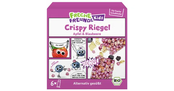 Bio-Müsliriegel mit Apfel und Heidelbeere, mit natürlichem Heidelbeeraroma Unser Freche Freunde Crispy Riegel mit Apfel und Blaubeere ist dein neuer Lieblings-Knusperriegel. Egal ob im Pausenrucksack, beim Sport oder als Snack auf dem Spielplatz – dieser Fruchtriegel liefert dir Energie, wenn du sie brauchst! – Zutaten: Vollkorn-HAFERflocken* 32%, Reissirup*, Reis-Crispies* (Reismehl*) 17%, Sonnenblumenöl*, Agavendicksaft*, Cornflakes* (Maismehl*), getrocknete Apfelstücke* 5%, gefriergetrocknetes Wildheidelbeerpulver* 1%, färbendes Schwarze-Johannisbeersaftkonzentrat*, natürliches Heidelbeeraroma 0,2%. *aus biologischem Landbau. Kann Spuren von SOJA, MILCH und SCHALENFRÜCHTEN enthalten. Zutaten: Vollkorn-HAFERflocken* 32%, Reissirup*, Reis-Crispies* (Reismehl*) 17%, Sonnenblumenöl*, Agavendicksaft*, Cornflakes* (Maismehl*), getrocknete Apfelstücke* 5%, gefriergetrocknetes Wildheidelbeerpulver* 1%, färbendes Schwarze-Johannisbeersaftkonzentrat*, natürliches Heidelbeeraroma 0,2%. *aus biologischem Landbau. Kann Spuren von SOJA, MILCH und SCHALENFRÜCHTEN enthalten.