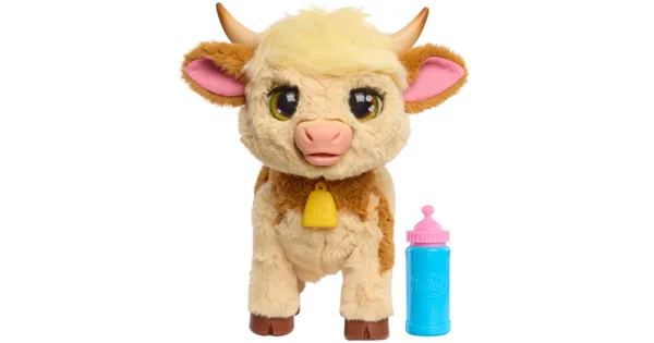 Mach dich bereit für Bauernhof-Spass, jede Menge Lachen und furReal Maggie, die Fütter- und Mitgeh-Kuh. Dieses a-MOO-zing Mini-Tierchen kommt aus den Schottischen Highlands und bietet über 50 verschiedene Sound- und Bewegungs-Kombinationen. Mit einer Höhe von 28 cm ist die animierte Plüschkuh immer bereit für einen Snack oder einen Spaziergang. Schiebe den Schalter an ihrem Bauch auf „On“, um das Spiel zu starten. Streiche ihr den Kopf nach vorne, um ihre flauschige Haarsträhne zu glätten, und höre eine Vielzahl niedlicher Muhs, Lachen und anderer witziger Mini-Kuh-Geräusche. Streiche über Maggies Kopf, um die braunen und grünen Augen blinzeln zu lassen. Drücke den Knopf auf ihrem Rücken, um Gehbewegungen und Schwanzwedeln zu aktivieren. Jetzt ist es Zeit für einen Snack! Setze die Flasche in ihren Mund, drehe sie leicht und begleite Maggie beim Gehen. Lausche niedlichen Glocken-, Schlürf- und Trinkgeräuschen. Benötigt 4 x AA-Batterien (inklusive). Dieses süsse, animierte Plüschtier ist ein tolles Überraschungsgeschenk für Tierliebhaber ab 4 Jahren.
