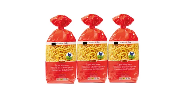 3-Eier-Teigwaren Die Gala 3-Eier Älpler Magronen bieten ein ausgezeichnetes Preis-Leistungsverhältnis und sind ideal für eine schnelle Mahlzeit. Hergestellt aus hochwertigen Eiern, bringen sie den traditionellen Geschmack der Schweizer Alpen direkt zu Ihnen nach Hause. Perfekt als Beilage oder Hauptgericht – einfach zubereitet und immer eine gute Wahl. – Zutaten: HARTWEIZENGRIESS, EIER 13,5% (aus Freilandhaltung). Zutaten: HARTWEIZENGRIESS, EIER 13,5% (aus Freilandhaltung).