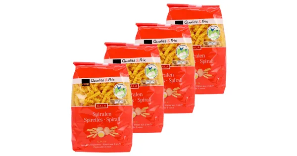 3-Eier-Teigwaren Die Gala 3-Eier Spiralen bieten ein hervorragendes Preis-Leistungsverhältnis und sind die ideale Beilage für verschiedenste GeriDie Gala 3-Eier Spiralen sind eine köstliche Pasta-Spezialität, die mit drei frischen Eiern pro Kilo hergestellt wird. Diese Nudchte. Hergestellt mit frischen Eiern, überzeugen sie durch ihren authentischen Geschmack und ihre einfache Zubereitung. Perfekt eln bieten ein hervorragendes Preis-Leistungsverhältnis und passen perfekt zu verschiedenen Saucen und Beilagen. Ideal für eine für schnelle und köstliche Mahlzeiten.schnelle und einfache Zubereitung von schmackhaften Gerichten. – Zutaten: HARTWEIZENGRIESS, EIER 13,5% (aus Freilandhaltung). Zutaten: HARTWEIZENGRIESS, EIER 13,5% (aus Freilandhaltung).