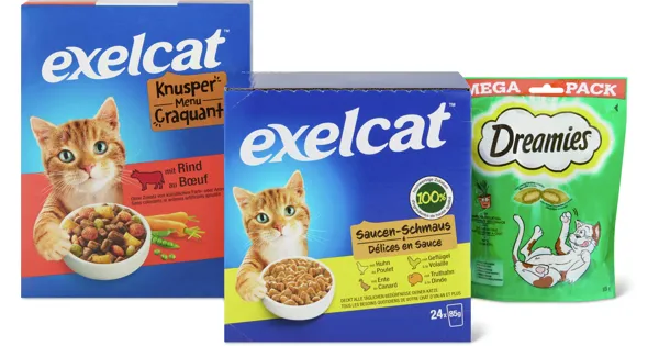 Ab 3 Stück, z.B. Exelcat Saucen-Schmaus mit Huhn, Ente, Geflügel und Truthahn, 24 x 85 g, 11.17 statt 15.95, 100 g = 0.55, Angebot gilt nur vom 4.11. bis 10.11.2025, solange Vorrat.