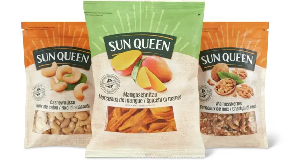 Ab 2 Stück, (ohne Sun Queen Apéro), z.B. Mangoschnitze getrocknet, 200 g, 3.52 statt 4.40, 100 g = 1.76, Angebot gilt nur vom 14.10. bis 20.10.2025, solange Vorrat.