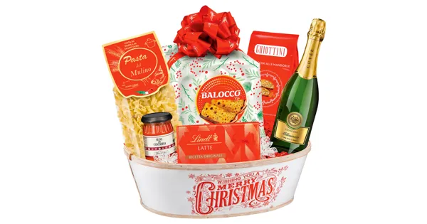 Ein stilvoller Geschenkkorb mit sechs italienischen Spezialitäten – von klassischem Panettone und feiner Milchschokolade bis hin zu aromatischer Pasta mit Sauce. Der süsse Spumante rundet das...