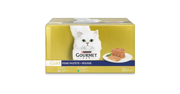 Alleinfuttermittel für ausgewachsene Katzen Um Ihrer Katze Abwechslung zu bieten, sind Sie immer auf der Suche nach vielfältigen Menüs, die Ihre Samtpfote geniessen wird. Deshalb hat GOURMET™ Gold - Feine Pastete - kreiert. Mit diesen köstlichen Rezepten können Sie den anspruchsvollen Gaumen Ihrer Katze mit einzigartigen Geschmackserlebnissen verwöhnen. Feine Pasteten mit Rind, Huhn, Lachs und anderen ausgewählten Zutaten wurden sorgfältig zubereitet, um Ihrer Katze eine delikate und zarte Überraschung zu bieten. Feine Pastete von GOURMET™ Gold – Verwöhnen Sie Ihre Katze mit einem zarten Genusserlebnis! Alle GOURMET™ Gold Sorten werden mit qualitativ hochwertigen Zutaten hergestellt und sind ohne zugesetzte Farbstoffe sowie ohne zugesetzte künstliche Aroma- und Konservierungsstoffe. GOURMET™ Gold Feine Pastete - Köstliche Pasteten mit Rind, Huhn, Lachs und anderen ausgewählten Zutaten wurden sorgfältig zubereitet, um IhrerKatze eine zarte Überraschung zu bieten. Alle GOURMET™ Gold Sorten werden mit qualitativ hochwertigen Zutaten hergestellt und sind ohne zugesetzte Farbstoffe sowie ohne zugesetzte künstliche Aroma- und Konservierungsstoffe.