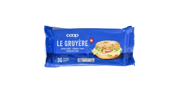 Vollfett-Schmelzkäse Die Gruyère Schmelzkäsescheiben überzeugen mit ihrem typischen, zarten Aroma, das aus hochwertigem Gruyère-Käse gewonnen wird. Ideal zum Schmelzen, verleihen sie heissen Snacks wie Toasts oder Burgern eine cremige Konsistenz. Praktisch portioniert, passen sie perfekt in die Küche jedes Käseliebhabers. – Zutaten: KÄSE 74% (Le Gruyère AOP [Schweiz]), Wasser, Schmelzsalz (E 331), Kochsalz. Zutaten: KÄSE 74% (Le Gruyère AOP [Schweiz]), Wasser, Schmelzsalz (E 331), Kochsalz.