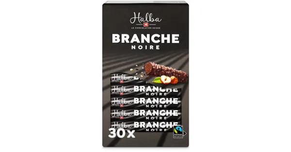 Dunkler Schweizer Schokoladestängel mit Pralinéfüllung und Haselnussstücken Die Halba Branches Noir vereinen zartschmelzende dunkle Schokolade mit einer feinen Füllung, die für genussvolle Momente sorgt. Dank ihres durchdachten Formats sind sie ideal für unterwegs oder als kleiner Snack zwischendurch. Ein unkompliziertes Vergnügen für Liebhaber von dunkler Schokolade. – Zutaten: Zucker, Kakaomasse, HASELNÜSSE 15%, Kakaobutter, Kokosfett, fettarmes Kakaopulver, VOLLMILCHPULVER, eingesottene BUTTER, MAGERMILCHPULVER, Emulgator (E 322 aus SOJA), natürliches Aroma. Kann Spuren von MANDELN enthalten. > Fairtrade-Zucker und -Kakao mit Mengenausgleich, Kokosnuss. Gesamtanteil 80.8%. Mehr Info: Fairtrade-Code 10281033. www.maxhavelaar.ch/mengenausgleich. Zutaten: Zucker, Kakaomasse, HASELNÜSSE 15%, Kakaobutter, Kokosfett, fettarmes Kakaopulver, VOLLMILCHPULVER, eingesottene BUTTER, MAGERMILCHPULVER, Emulgator (E 322 aus SOJA), natürliches Aroma. Kann Spuren von MANDELN enthalten. > Fairtrade-Zucker und -Kakao mit Mengenausgleich, Kokosnuss. Gesamtanteil 80.8%. Mehr Info: Fairtrade-Code 10281033. www.maxhavelaar.ch/mengenausgleich.
