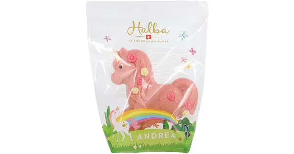 Weisse Schweizer Schokolade mit roter Kakaomasse, dekoriert Die Halba Einhorn rosa Andrea verwöhnt mit zartschmelzender Schokolade in einer traumhaften rosa Farbgebung. Dieses süsse Highlight...