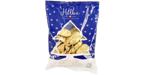 Schweizer Milchschokolade mit Haselnussfüllung – Zutaten: Zucker, Kakaobutter 23%, VOLLMILCHPULVER, Kakaomasse 10%, Kokosfett, HASELNÜSSE 5%, MAGERMILCHPULVER, eingesottene BUTTER, Emulgator (E 322...
