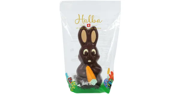 Schweizer Dunkle Schokolade mit Marzipan, dekoriert Der Halba Hase Noir mit Marzipanrüebli überzeugt mit zartschmelzender dunkler Schokolade, die harmonisch auf die feine Süsse des Marzipans...