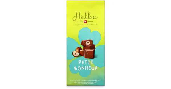 Schweizer Milchschokolade mit Pralinéfüllung, Haselnüssen und Waffelgranulat Die Halba Praliné Petit Bonheur bietet eine feine Auswahl köstlicher Pralinen, die mit hochwertiger Schokolade veredelt...