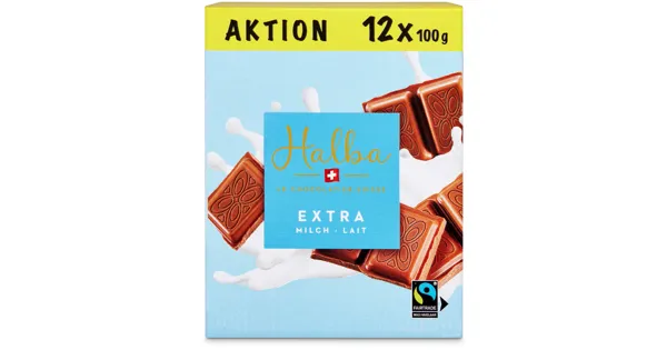Schweizer Milchschokolade – Zutaten: Zucker, VOLLMILCHPULVER, Kakaobutter, Kakaomasse, HASELNÜSSE, Emulgator (E 322 aus SOJA), natürliches Aroma. Kann Spuren von MANDELN enthalten. Kakao: 31% mindestens > Fairtrade-Zucker und -Kakao mit Mengenausgleich. Gesamtanteil: 71,7%. Mehr Info: Fairtrade-Code1028815. www.maxhavelaar.ch/mengenausgleich. Zutaten: Zucker, VOLLMILCHPULVER, Kakaobutter, Kakaomasse, HASELNÜSSE, Emulgator (E 322 aus SOJA), natürliches Aroma. Kann Spuren von MANDELN enthalten. Kakao: 31% mindestens > Fairtrade-Zucker und -Kakao mit Mengenausgleich. Gesamtanteil: 71,7%. Mehr Info: Fairtrade-Code1028815. www.maxhavelaar.ch/mengenausgleich.