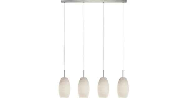 Die Pendelleuchte Batista von Eglo fügt sich mit ihrem schlichten und modernen Design nahtlos in deinen Einrichtungsstil ein und bietet eine gemütliche Beleuchtung im Ess- oder Wohnzimmer. Sie besteht aus einer nickel-matten, länglichen Metall-Abhängung, die mit vier weissen, runden Wischglas-Schirmen kombiniert ist.