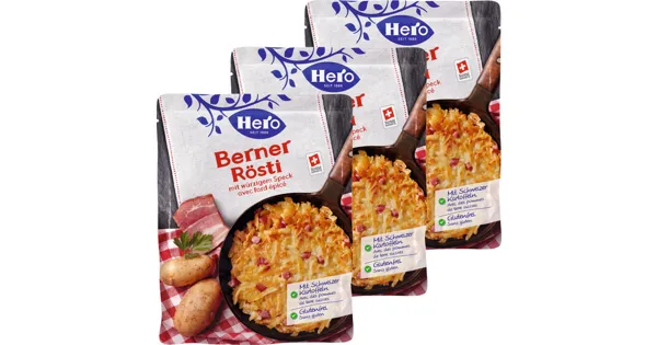 Rösti mit Speck Die Berner Rösti ist seit jeher ein Aushängeschild der Berner Küche. Feine Hero Rösti aus Schweizer Kartoffeln vereint mit würzigem Speck. Einfache und schnelle Zubereitung. Die...