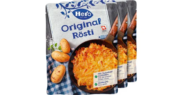Hero Rösti Original überzeugt seit 40 Jahren. Unverändert und unvergleichlich knusprig. Für das Lieblingsgericht der Schweiz verwendet Hero nur die besten Kartoffeln aus kontrolliertem Anbau....
