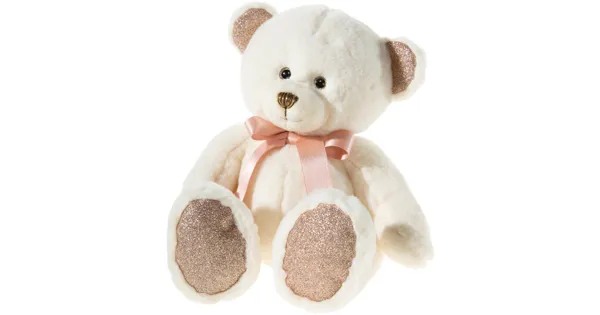 Funkelnd und glitzernd schauen sich die treuen Augen vom Bären Creamie neugierig um. Öhrchen, Äuglein, Näschen, Tatzen und Schleifchen schimmern und laden zum Verschenken an besonders liebe Menschen ein. Creamie hat wunderbar weiches Fell in einer edlen Farbe und eine hübsche Schleife um den Hals. Beliebt bei Kindern als schickes Schmusetier, als ein treuer Freund und Tröster.