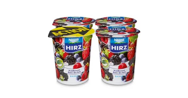 Teilentrahmtes Joghurt mit Waldbeeren, (3.3 % Fett im Milchanteil) 4x180g. Nestle Hirz - Lust am Genuss Nestle Hirz - Genuss Garantie – Zutaten: VOLLMILCH, MAGERMILCH, Waldbeeren 7.5 % (schwarzer...
