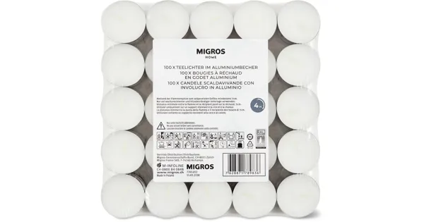 In Mehrfach- oder Sonderpackungen, z.B. 4 h Brenndauer, erhältlich in Weiss, 100 Stück, 6.90 statt 9.90, Angebot gilt nur vom 20.1. bis 2.2.2026, solange Vorrat.