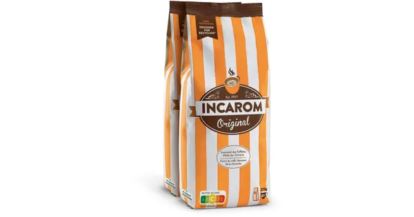 Löslicher Extrakt aus Kaffee und Zichorie, mit Glucosesirup Entdecken Sie Incarom Original, den unverwechselbaren Geschmack von Incarom, die einzigartige Verbindung der Intensität von Kaffee und der Milde von Zichorie. Ihre Schweizer Marke, die sich seit 1957 grosser Beliebtheit erfreut! Aroma: Die perfekte Verbindung der Intensität von Kaffees und der Milde von Zichorie. Die Zichorie mildert die Bitterkeit des Kaffees und bewahrt gleichzeitig seine Aromen, damit Sie ganz sanft stimuliert werden! Ein einzigartiger, subtiler Geschmack mit Noten von Zichorie und Karamell, den Sie lieben werden! Inhalt: Incarom Original enthält 2 Beutel à 275g (insgesamt 550g) eines Extrakts von löslichem Kaffee und Zichorien und Glukosesirup. Aufbewahrung: Trocken und vor Hitze geschützt aufbewahren. – Zutaten: löslicher Extrakt 50 % (aus Kaffee 52 % und Zichorie 48 %), Glucosesirup 50 %. Kann GERSTE, ROGGEN, HAFER enthalten. Zutaten: löslicher Extrakt 50 % (aus Kaffee 52 % und Zichorie 48 %), Glucosesirup 50 %. Kann GERSTE, ROGGEN, HAFER enthalten.