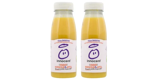 Mango- & Maracuja-Mischung aus püriertem Obst und Fruchsaft (Direktsaft) 250ml. – Zutaten: Apfelsaft, Mangopüree 16%, Bananenpüree, Orangensaft, Maracujasaft 3%, Pfirischpüree, Limettensaft. Zutaten: Apfelsaft, Mangopüree 16%, Bananenpüree, Orangensaft, Maracujasaft 3%, Pfirischpüree, Limettensaft.