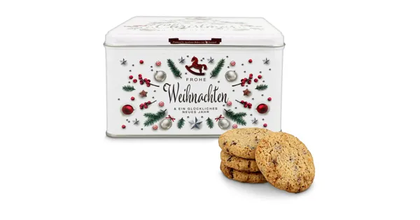 Zutaten: WEIZENmehl, Zucker, Pflanzenfett (Palmöl, Rapsöl), Milchschokolade 10% (Zucker, VollMILCHpulver, Kakaobutter, Kakaomasse 12%, Lactose (MILCH), MagerMILCHpulver, Emulgator: Sonnenblumen-Lecithin, natürliches Vanillearoma), Bitterschokolade 10% (Zucker, Kakaomasse 48%, Kakaobutter, fettreduziertes Kakaopulver alkalisiert, Emulgator: Sonnenblumen-Lecithin), Kokosraspeln, Butter (MILCH), Rohrzucker, Backtriebmittel (Ammoniumhydrogencarbonat, Natriumhydrogencarbonat) Speisesalz, natürliches Aroma, natürliches Vanillearoma. Kann Spuren von SOJA und SCHALENFRÜCHTEN enthalten.